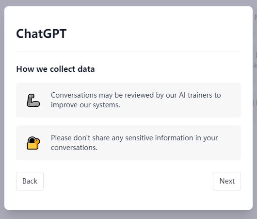 输入刚刚注册的邮箱和密码,然后你会给你一些温馨提示,说对话会被收集,被审查,用来改进系统,所以不要分享敏感信息:
