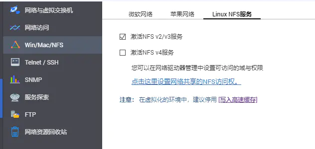 威联通内置了对NFS的支持,但是默认并没有启动,你可以启动他们,注意启用NFS v3服务,好些NFS客户端并不支持v4(说的就是微软内置的NFS客户端):