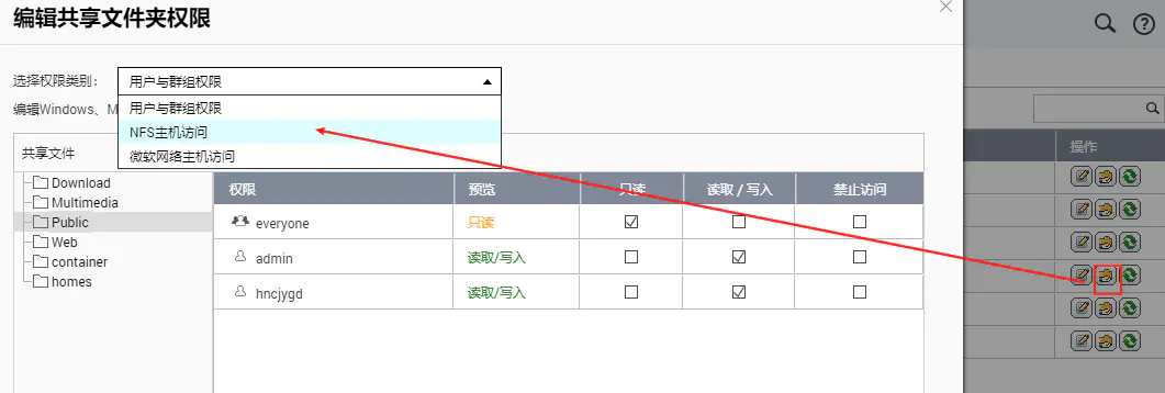 然后我们可以在共享文件夹中设置NFS的共享选项: