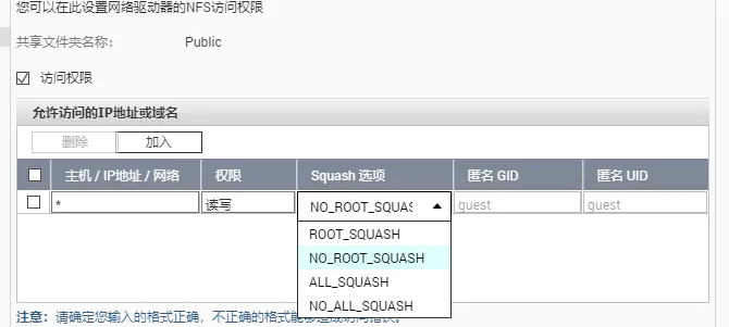 由于我们只是自己使用,为了方便直接设置NO_ROOT_SQUASH就可以了,如果是共享给多个人切记不要这么设置。最好是创建群组赋予相应的读写权限,然后设置好各个用户的读写权限,并设置Squash选项为非no_root_squash.