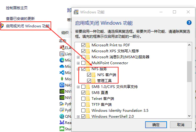 NAS中提供了NFS服务,如果想要在本地使用就需要在本机上安装NFS客户端来连接他了。win10中可以通过控制面板-程序-启用或关闭Windows功能中来启用NFS客户端: