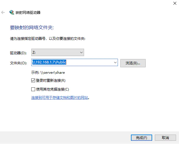 指定一个盘符然后就是输入\服务器ip\Public 这个共享文件夹地址。这时会弹出让你输入凭证,此时输入用户名就可以了: