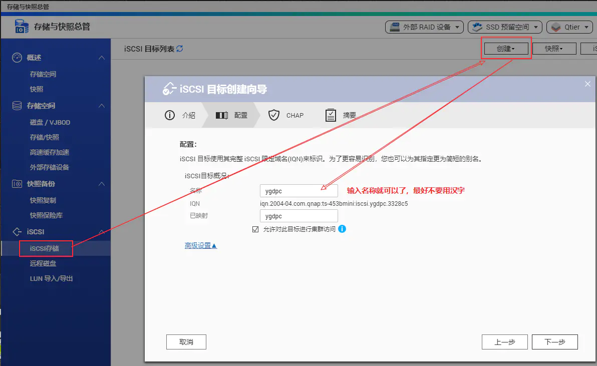 在存储与快照总管中选择ISCSI存储并新建一个ISCSI: