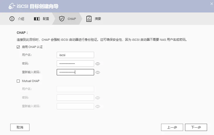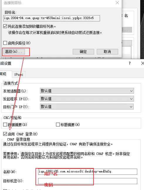 配置身份验证,ISCSI默认是不需要验证用户名密码的,你也可以开启他们这样会在连接到此目标后验证身份,如果是自家电脑使用就不需要验证了,如果需要在公网上使用还是开启为好。