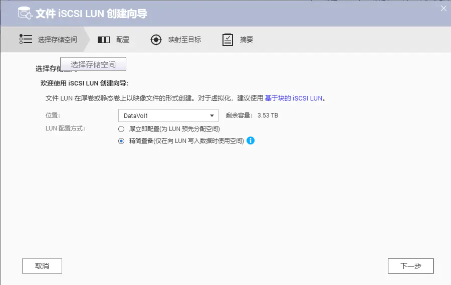 配置ISCSILUN,可以理解为这个远程硬盘的位置,根据说明厚立即配置就是为LUN预先配置空间,这个空间即使没有用也在NAS磁盘上被占用了。而精简置备意思就是根据写入的数据动态增加空间,这里必然是精简置备了啊:
