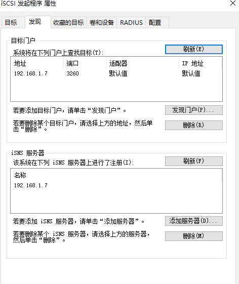 在发现中点击发现门户输入NAS的ip地址(如果你更改了默认端口3260还需要设置端口),然后点击添加服务器设置同样的值: