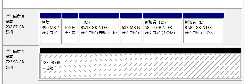 此时你在我的电脑中并不能发现你挂载的硬盘,但是你可以在磁盘管理中看到,就跟你新插入一个硬盘一样: