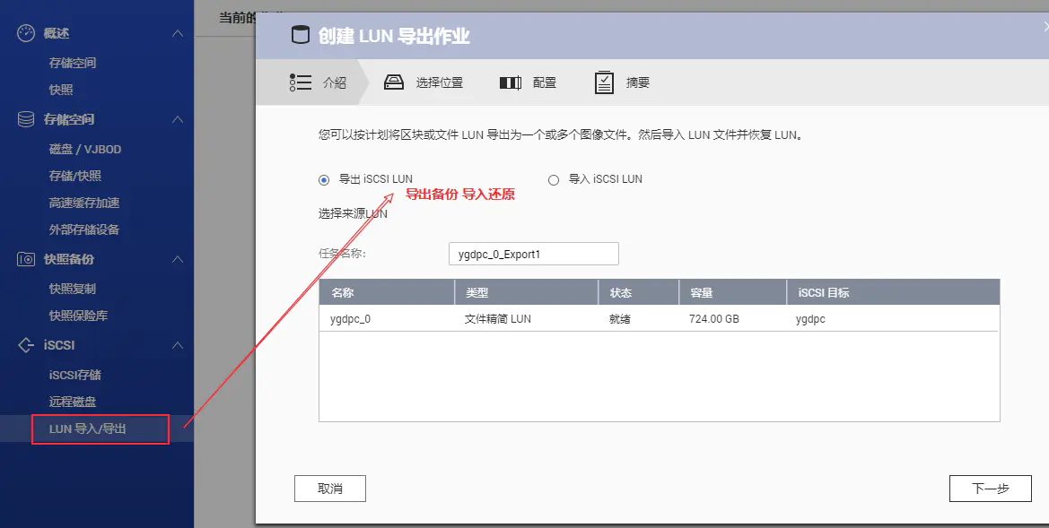 实际上你完全可以将它当做本地硬盘使用,在里面安装软件都可以。并且在NAS中我们可以使用LUN导入/导出功能定时创建备份: