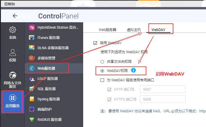首先启用控制台中的Web服务器中的WebDAV:
