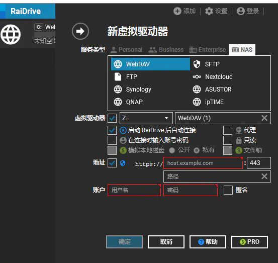 这里使用RaiDriver 软件来挂载这个WebDav,实际上这个软件可以挂载非常多协议甚至云盘上的空间到本地盘符上。