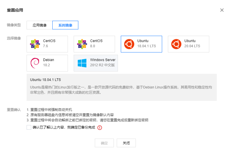 实例默认系统选择安装Ubuntu系统(新安装直接选择,或者重置应用)