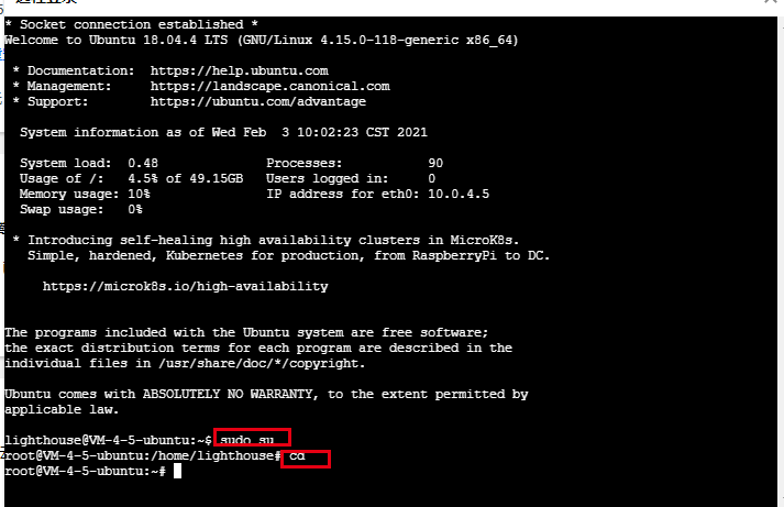 进入实例管理页面,依次点击“远程登陆”-(一键登录)“登陆”,会弹出在线webshell,输入 【sudo su 】 切换为root登陆,并输出【cd】切换目录。
