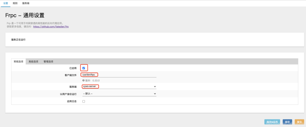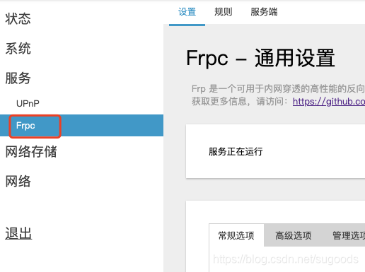 3、安装成功后,重启openwrt,Frpc图形管理界面就能在路由器的管理界面看到了。位置:路由器管理界面 -> 服务 -> Frpc