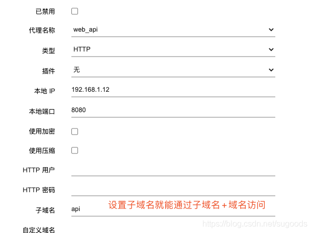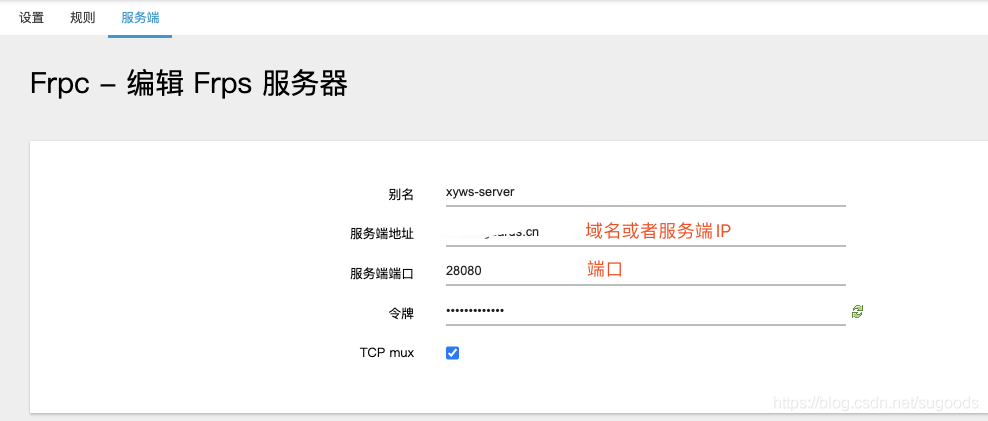 6、最后设置内网穿透的规则即可。贴个我自己的配置,如果累心是http或者是https就不需要配置远程端口,因为在配置服务端的时候就指定好了。如果类型是TCP或UDP就要设置远程端口。