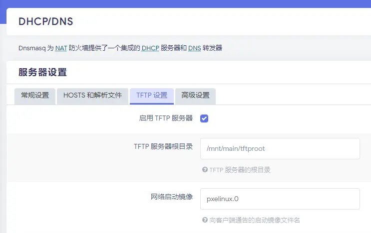 网络-DHCP/DNS 处提供了 TFTP 配置,其中“启用 TFTP 服务器”调整为“使能”(即勾选),“TFTP 服务器根目录”填写