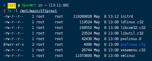 将步骤五中casper文件夹中的initrd和vmlinuz文件上传到 OpenWrt 的/mnt/main/tftproot目录。