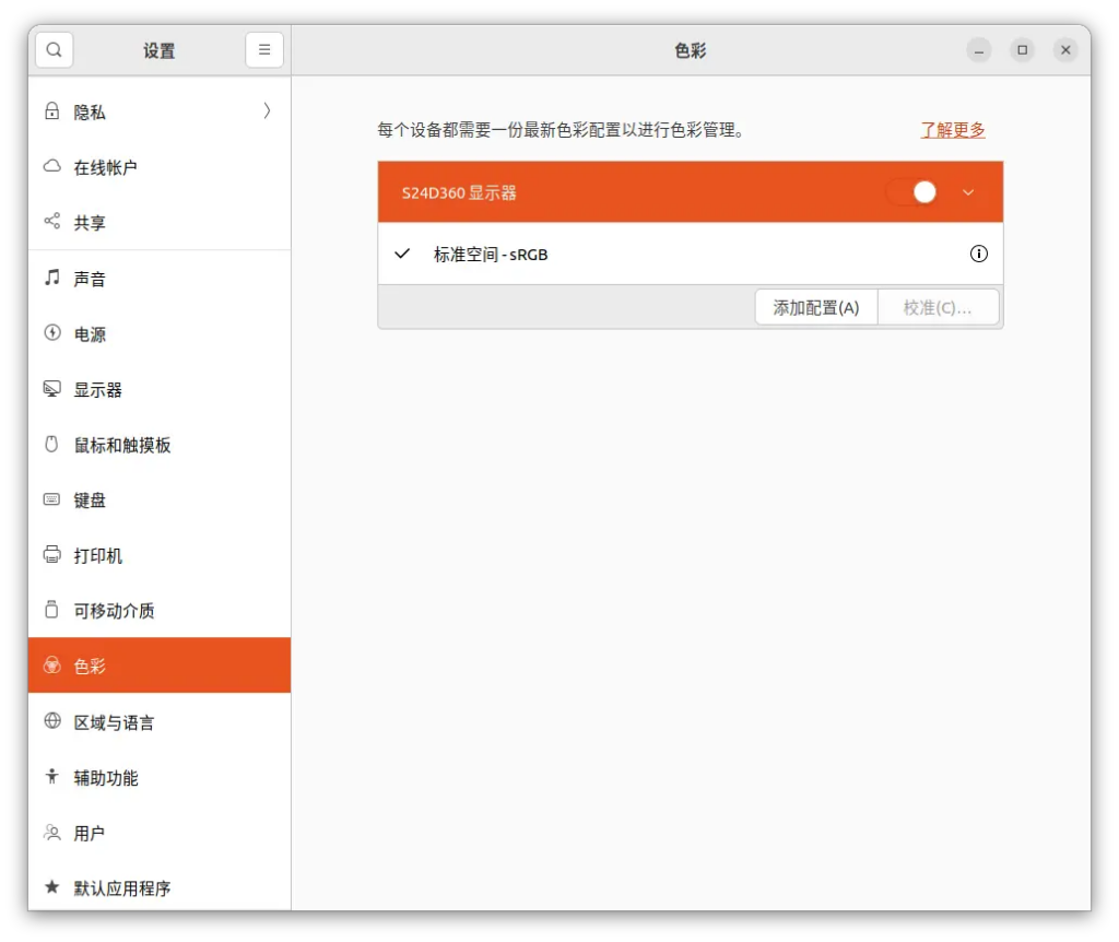 由于 NVIDIA 显卡对 Linux 一贯以来的不友好和 Ubuntu 22.04 的 bug,部分使用 NVIDIA 显卡输出的设备在 Ubuntu 22.04 下默认色彩异常,可以通过“设置”里的“色彩”调整解决。
