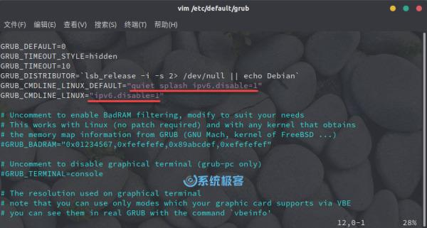 2.修改GRUB_CMDLINE_LINUX_DEFAULT 和GRUB_CMDLINE_LINUX 以在启动时禁用IPv6:GRUB_CMDLINE_LINUX_DEFAULT="quiet splash ipv6.disable=1"GRUB_CMDLINE_LINUX="ipv6.disable=1"