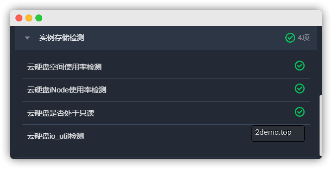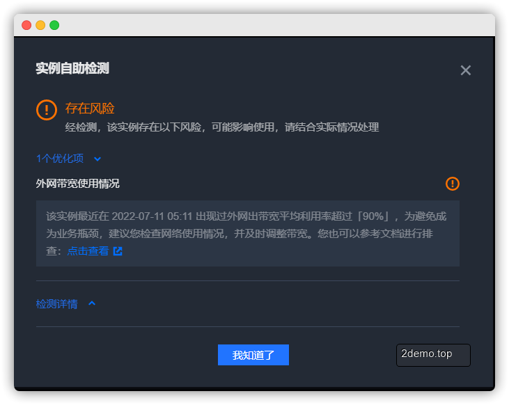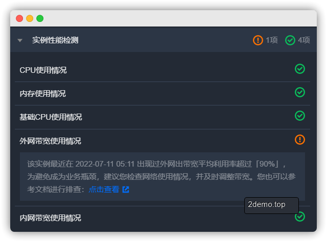 **实例自助检测**:可以为你检测服务器带宽,硬盘,CPU等状态并提出优化建议