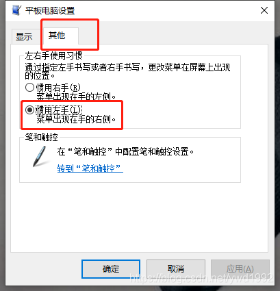 在打开的窗口中切换到“其他”页,将“左右手使用习惯”改为“惯用左手”保存即可