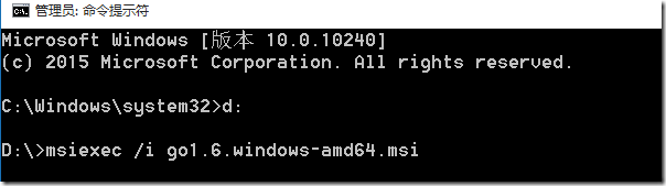 以管理员的身份运行cmd,找到go1.6.windows-amd64.msi所在的目录,并输入msiexec /i go1.6.windows-amd64.msi如下图(放在D盘根目录):